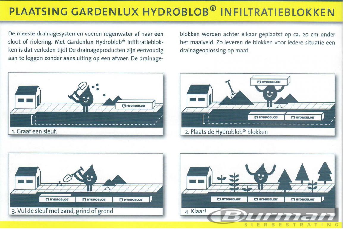 Wateroverlast door hevige regenval komt steeds vaker voor. Ergert u zich ook zo aan die plassen in de tuin, op het terras of op uw op- en afrit? Probeer dan Gardenlux Hydroblob®. Deze eenvoudige doe-het–zelf oplossing zorgt dat regenwater over de volledige lengte van uw terras en op- en afritten snel wordt opgenomen. Dankzij de infiltratieblokken wordt het overtollige water gebufferd en geïnfiltreerd in de bodem.