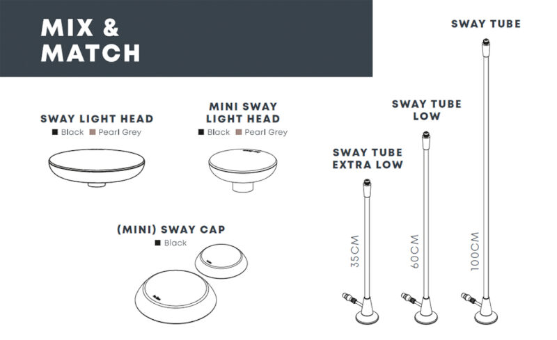 SWAY LIGHT HEAD dient gecombineerd te worden met één van de flexibele staanders SWAY TUBE (100 cm), SWAY TUBE LOW (60 cm) of SWAY TUBE EXTRA LOW (35 cm). Samen vormen deze producten SWAY. Deze samengestelde armaturen creëren een uniek lichtbeeld die in volledige harmonie is met de natuur.