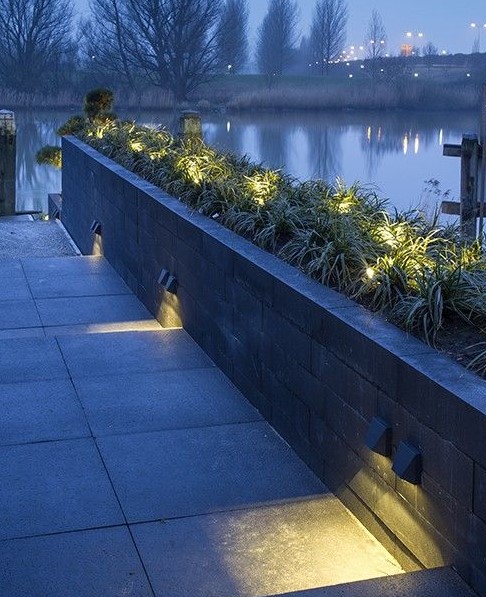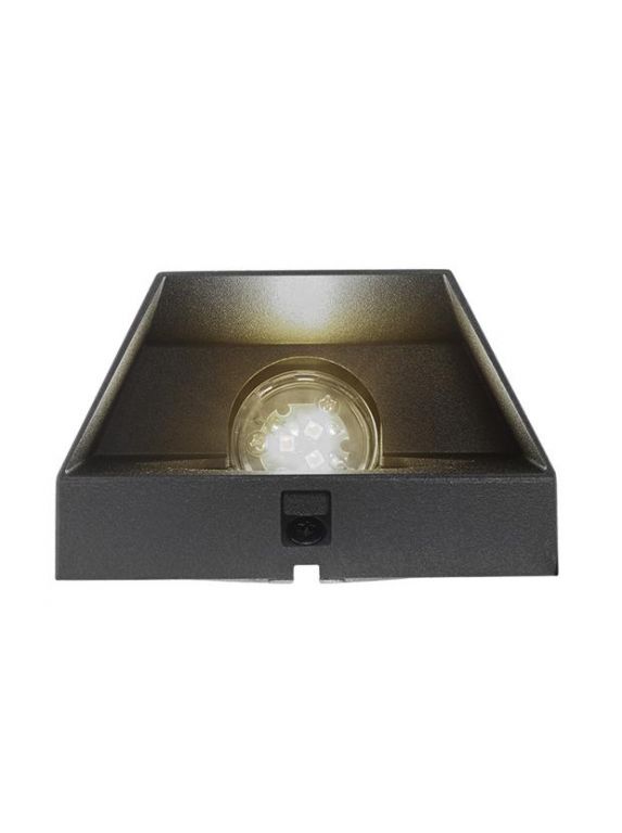 Wedge vierkant wandarmatuur in donkergrijs gecoat aluminium. Geeft een indirect gebundeld Warm White licht. Mooi voor het verlichten van de schutting, oprit of terras. Verblindt niet.
