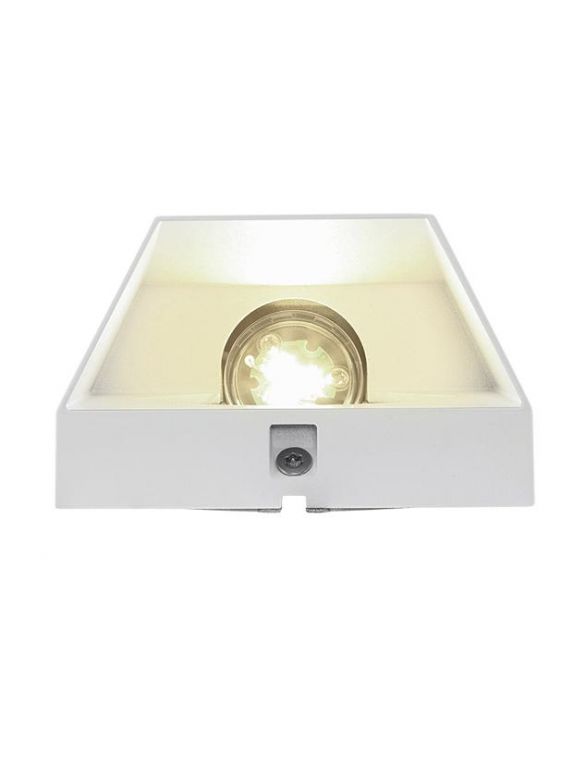 Wedge vierkant wandarmatuur in wit gecoat aluminium. Geeft een indirect gebundeld Warm White licht. Mooi voor het verlichten van de schutting, oprit of terras. Verblindt niet.